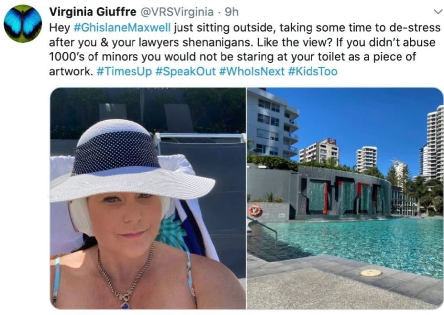 "Hola Ghislaine Maxwell, solo estoy aquí sentada al aire libre, tomándome un tiempo para desestresarme después de tus travesuras y las de tus abogados. ¿Te gusta la vista?", dijo la mujer, de 36 años en el tuit, y continuó: "Si no hubieras abusado de miles de menores, ahora no estarías mirando tu inodoro como si fuera una obra de arte", puntualizó.