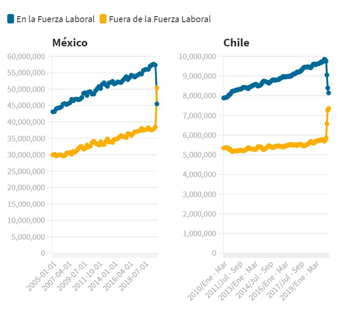 Por eso, a partir de mayo y por primera vez en los últimos 15 años, en México y Perú la cantidad de personas en edad de trabajar que están fuera de la fuerza laboral superó a la de quienes forman parte ella, mientras que en Chile y Colombia hay una tendencia similar.