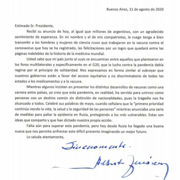 "Recibí su anuncio de hoy, al igual que millones de argentinos, con un agradecido sentimiento de esperanza. En mi nombre y el de mis compatriotas, le ruego tenga a bien transmitir a los hombres y mujeres de ciencia rusos que trabajaron en la vacuna contra el coronavirus que hoy se ha registrado, las felicitaciones por un logro que quedará entre las páginas indelebles de la historia de la medicina mundial", agrega en la misiva.