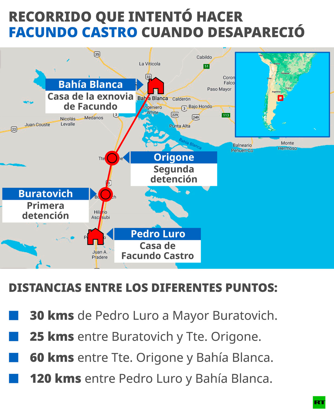 120 kilómetros separan a la pequeña localidad de Pedro Luro de la ciudad de Bahía Blanca, el cuarto centro urbano más importante de la provincia de Buenos Aires, que por estar en el extremo sur conecta con la Patagonia. Esa distancia intentó recorrer Facundo Astudillo Castro el pasado 30 de abril para ver a su exnovia, con quien había terminado en febrero una relación y convivencia de dos años, que quería recomponer.
