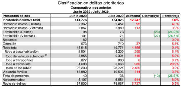De enero a julio de este año, México acumula 20.494 homicidios dolosos, lo que implica un aumento del 1,5 % respecto al mismo período de 2019, cuando se reportaron 20.176 asesinatos.