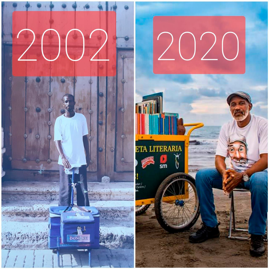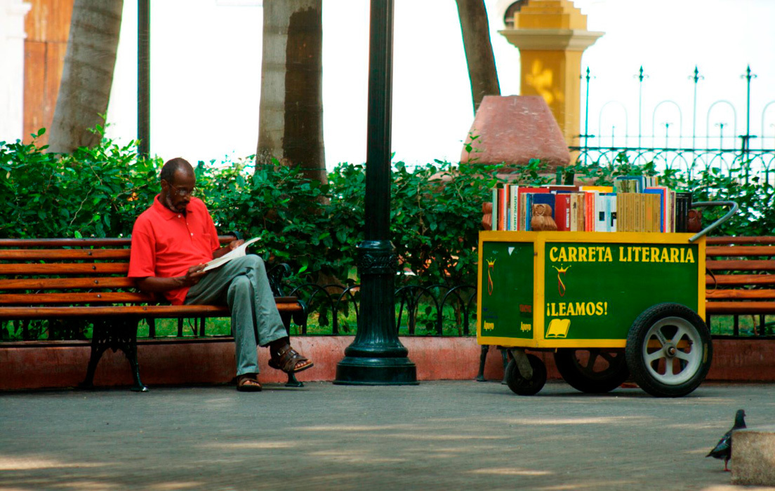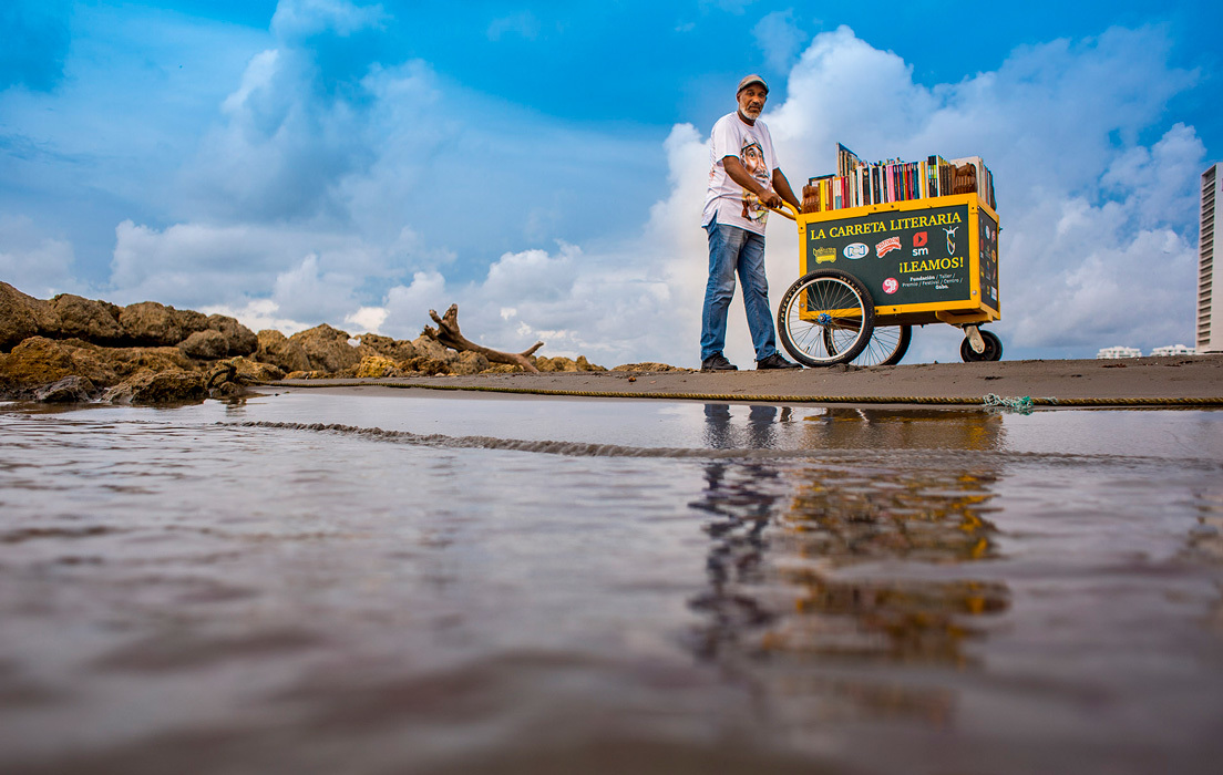 Como si fuera una historia sacada de las páginas que día a día narra para quienes lo quieran escuchar, el colombiano Martín Roberto Murillo cambió la carreta donde vendía agua, refrescos y cervezas por las calles del centro histórico de Cartagena por una llena de libros.