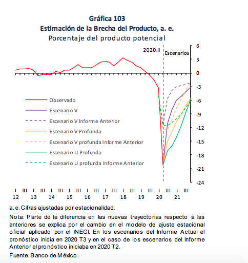 En el escenario de afectación tipo V profunda, Banxico evalúa una menor recuperación de la actividad económica hacia el tercer trimestre del año, que se traduciría en una contracción del 11,3 % para 2020 y en un crecimiento del 2,8 % para 2021. En el pasado informe trimestral, el organismo estimaba una caída del PIB del 8,8 % y un aumento del 4,1 % para el próximo año.