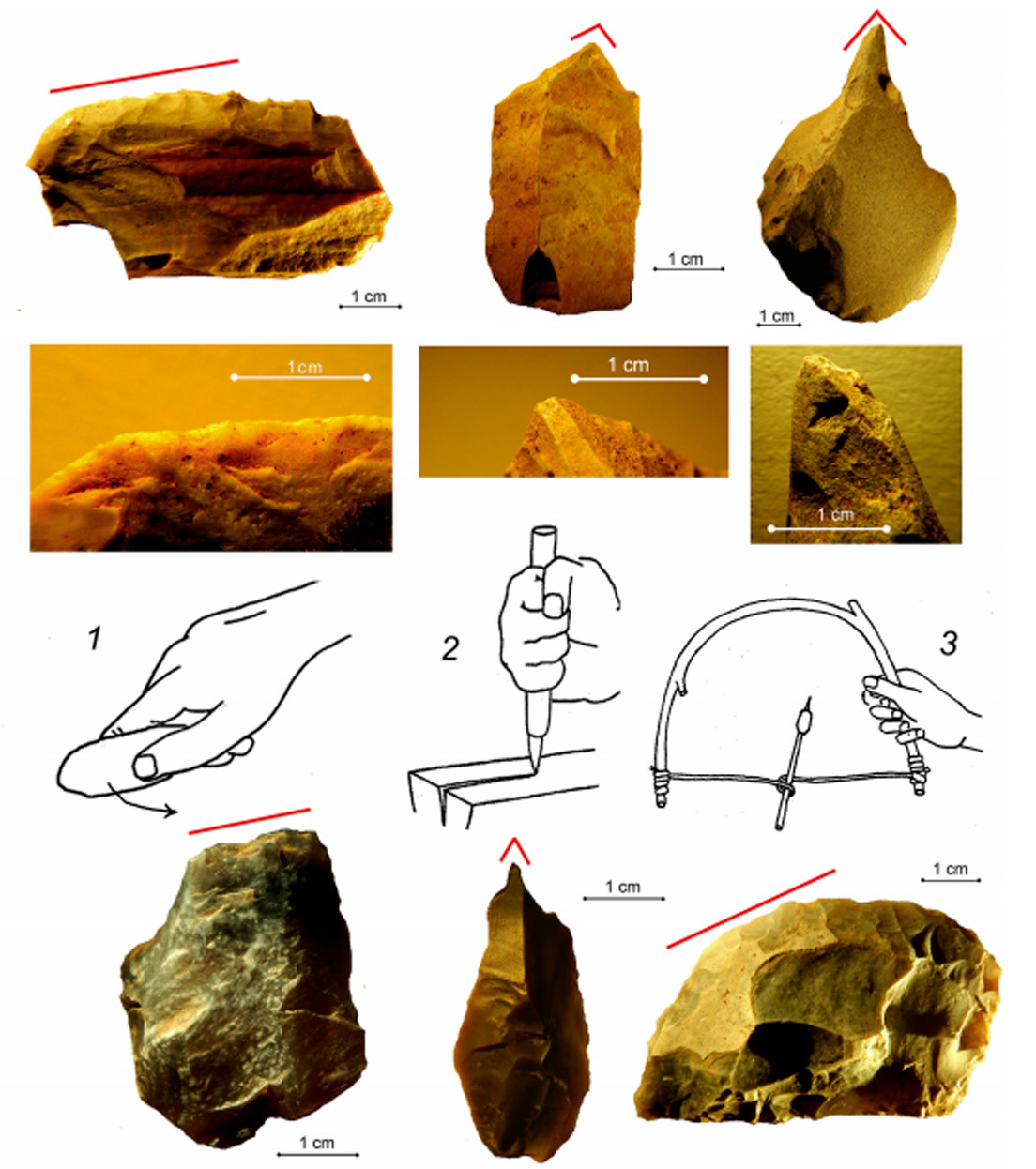 Los resultados del examen microscópico permitieron identificar la secuencia de producción, así como los instrumentos de piedra probablemente utilizados para procesar el marfil de mamut. Las marcas de impacto y las muescas presentes en los artefactos hallados revelan el uso de hojas niveladoras, taladros de mano y buriles.
