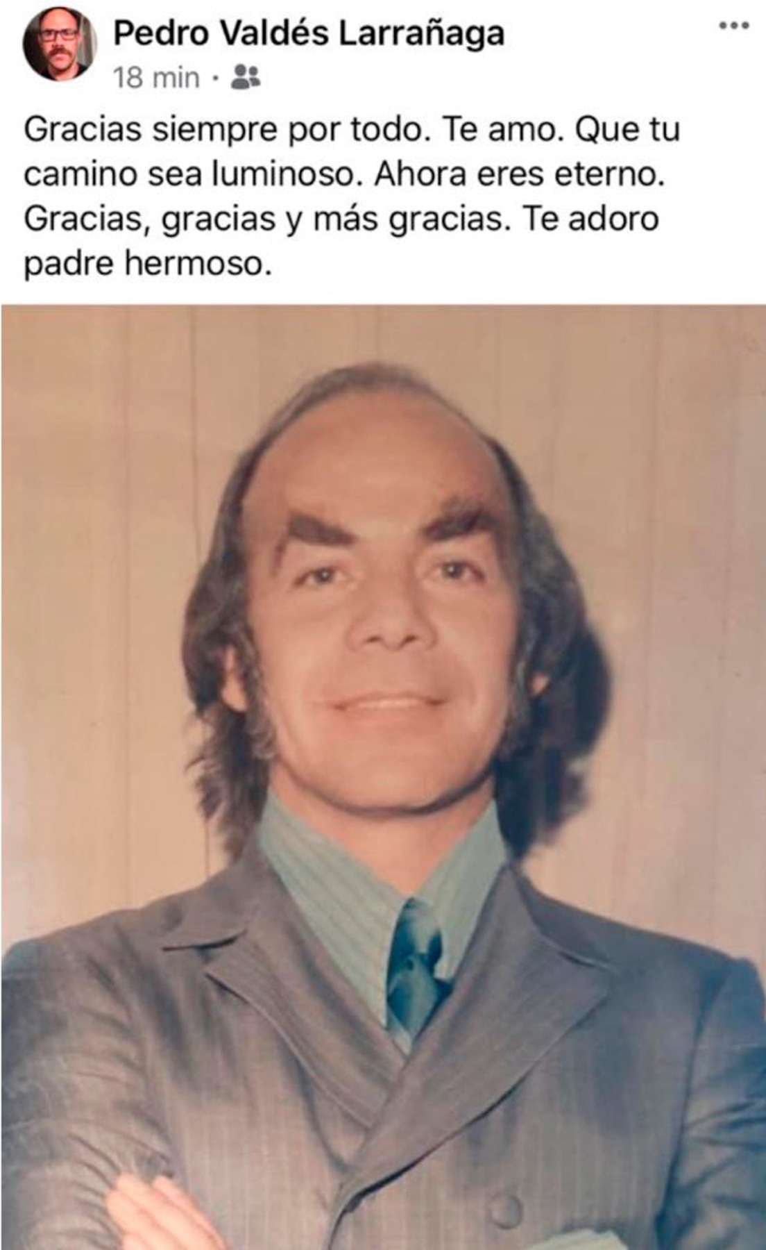 La noticia fue confirmada por Pedro Valdés Larrañaga, uno de sus hijos, quien en su redes sociales escribió: "Gracias siempre por todo. Te amo. Que tu camino sea luminoso. Ahora eres eterno".