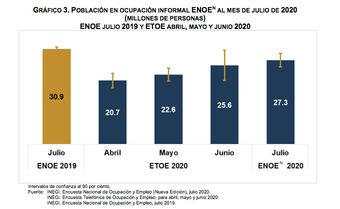 Pese al crecimiento en la población ocupada, el Inegi apunta a un alza de la informalidad. En julio, se estimó que había 27,3 millones de personas en este sector, lo que implicó un aumento de 1,7 millones respecto a junio, y un alza de 6,6 millones en comparación con abril.
