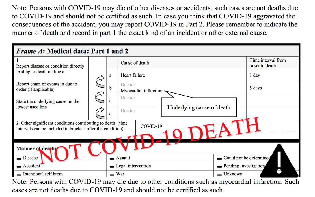 Según establecen las pautas de la Organización Mundial de la Salud (OMS), tales muertes no deben ser registradas como muertes a causa del coronavirus: "Las personas con covid-19 pueden morir por otras enfermedades o accidentes; estos casos no son muertes por covid-19 y no deben ser certificados como tales".