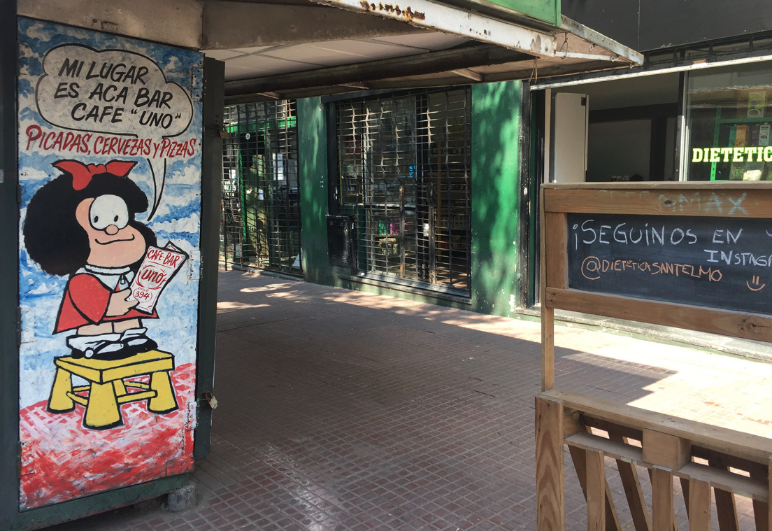 Por eso el barrio y Mafalda son uno mismo. Su rostro aparece por doquier. En paredes, camisetas, tazas, puestos de diarios, pijamas, llaveros, mates.