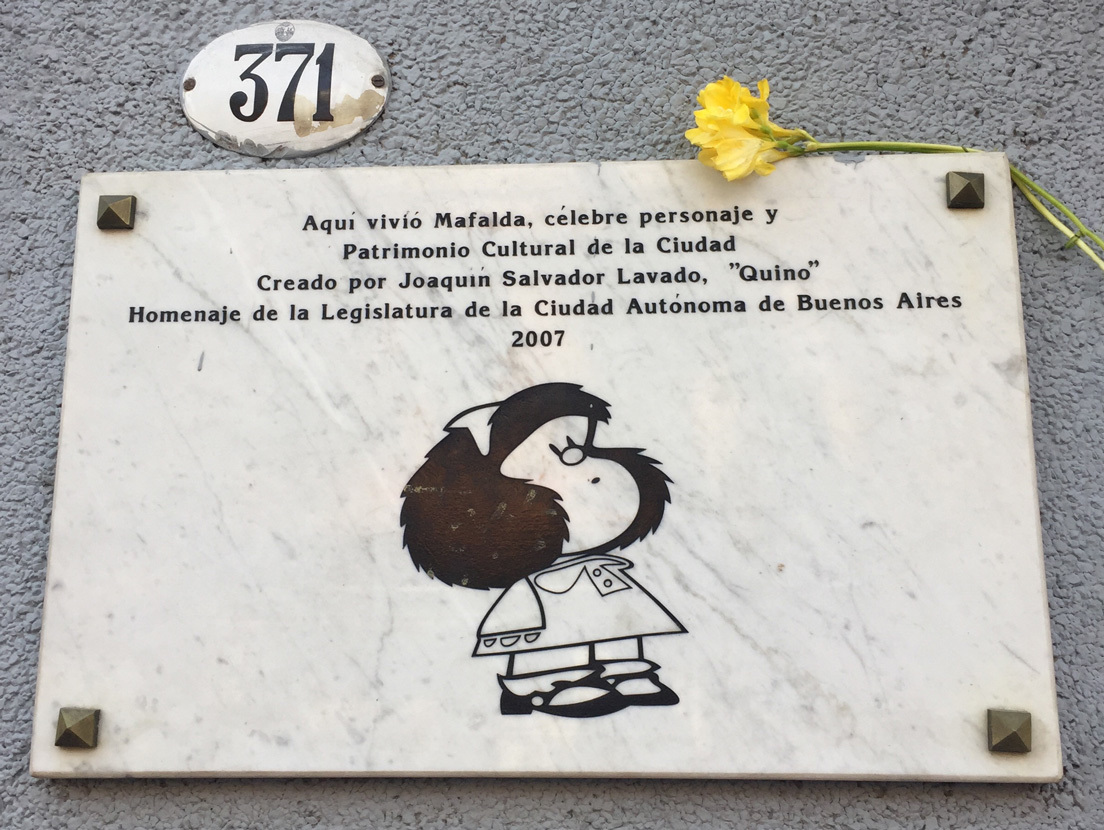 La elección de San Telmo para emplazar las esculturas de tan afamados personajes no fue casual. En eledificio, ubicado en la calle Chile 371, una placa recuerda que ahí vivió Mafalda. Era la dirección de la niña en la tira: ahí vivía con sus padres y su hermano menor, y de ese bloque salía para jugar con sus amigos Susanita, Manolito, Miguelito, Felipe y Libertad.