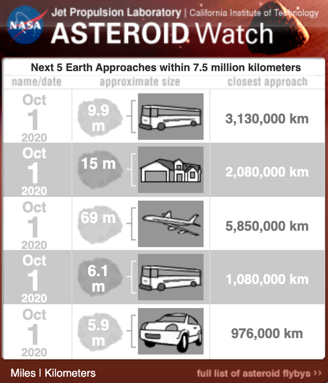El mayor de los visitantes es el 2020 RJ3, que mide 69 metros de diámetro, cuya grandeza es comparable con una aeronave o la mitad de la altura de la Gran Pirámide de Giza. Los expertos calculan que pasará a 5,85 millones de kilómetros.