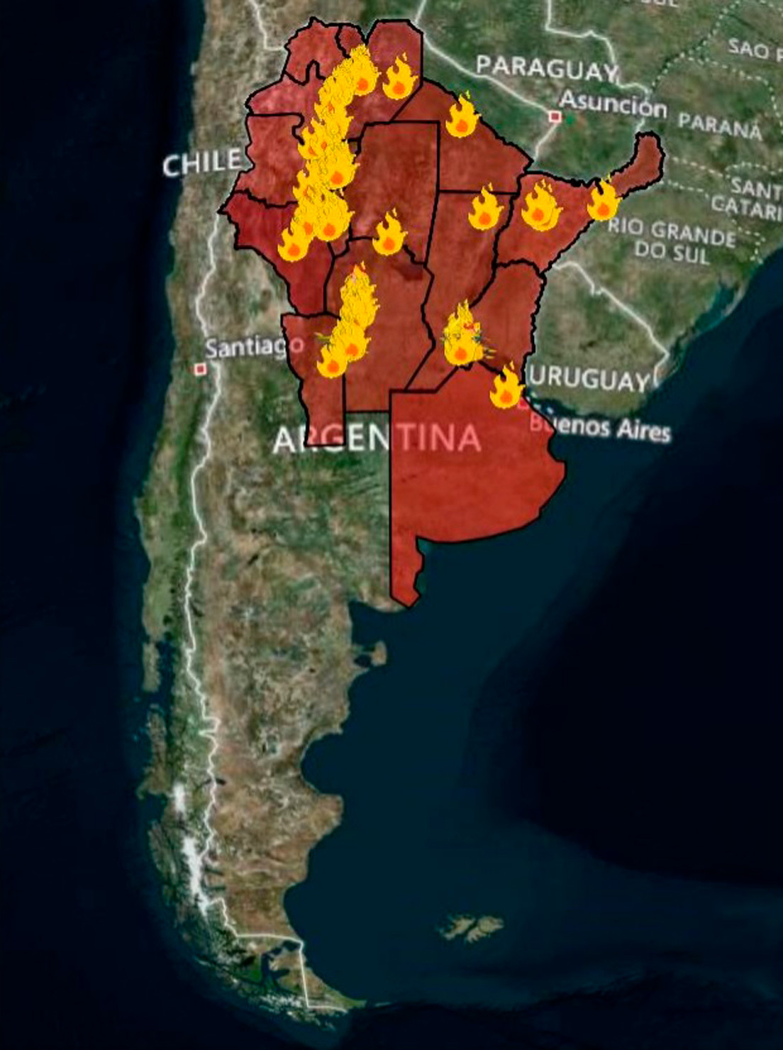 Más de la mitad de las provincias argentinas están afectadas por incendios, según el reporte del Servicio Nacional del Manejo del Fuego (SNMF) publicado el 2 de octubre, destacándose los focos en el Delta del Paraná —ubicados en la provincia de Entre Ríos, pero afectando también a Santa Fe— y Córdoba, una importante jurisdicción de clima seco en la zona central del país.
