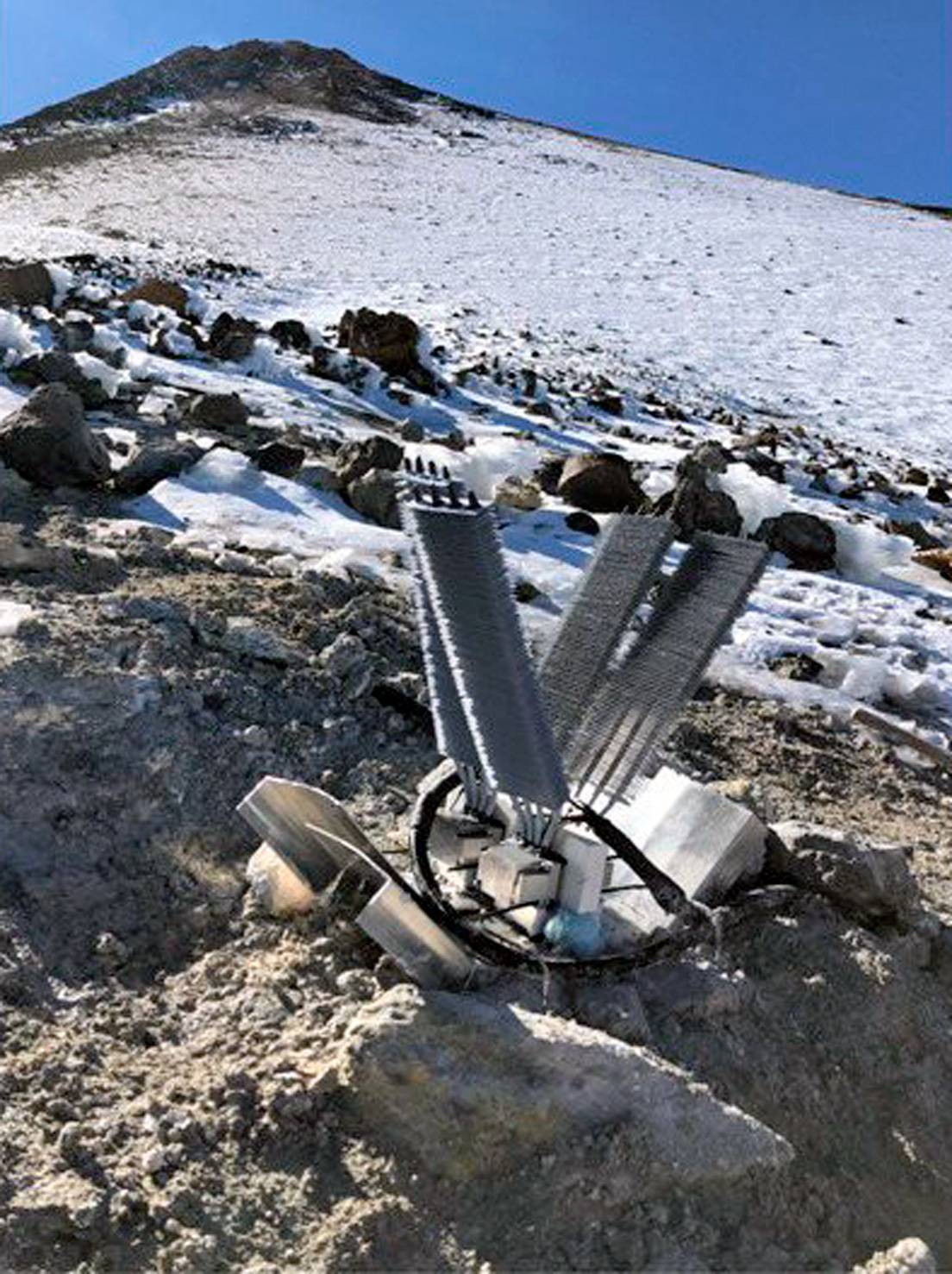 Uno de estos dispositivos, que mide un metro de alto, fue instalado a finales de agosto en el Parque Nacional de Timanfaya, en la isla canaria de Lanzarote, sobre una vasta anomalía geotérmica donde las temperaturas alcanzan hasta 500º C a solo dos metros de profundidad (en el área elegida rondan los 170º C).