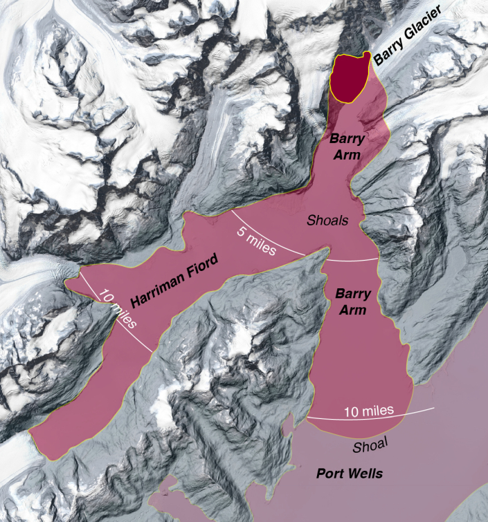 En 2013, uno de los autores de la carta, Chunli Dai, dijo a la NASA que el derrumbe de una ladera en Barry Arm "liberaría 16 veces más escombros y 11 veces más energía que el deslizamiento de tierra de 1958 en la bahía de Lituya", donde tuvo lugar el mayor megatsunami registrado de la historia, de 524 metros de altura.