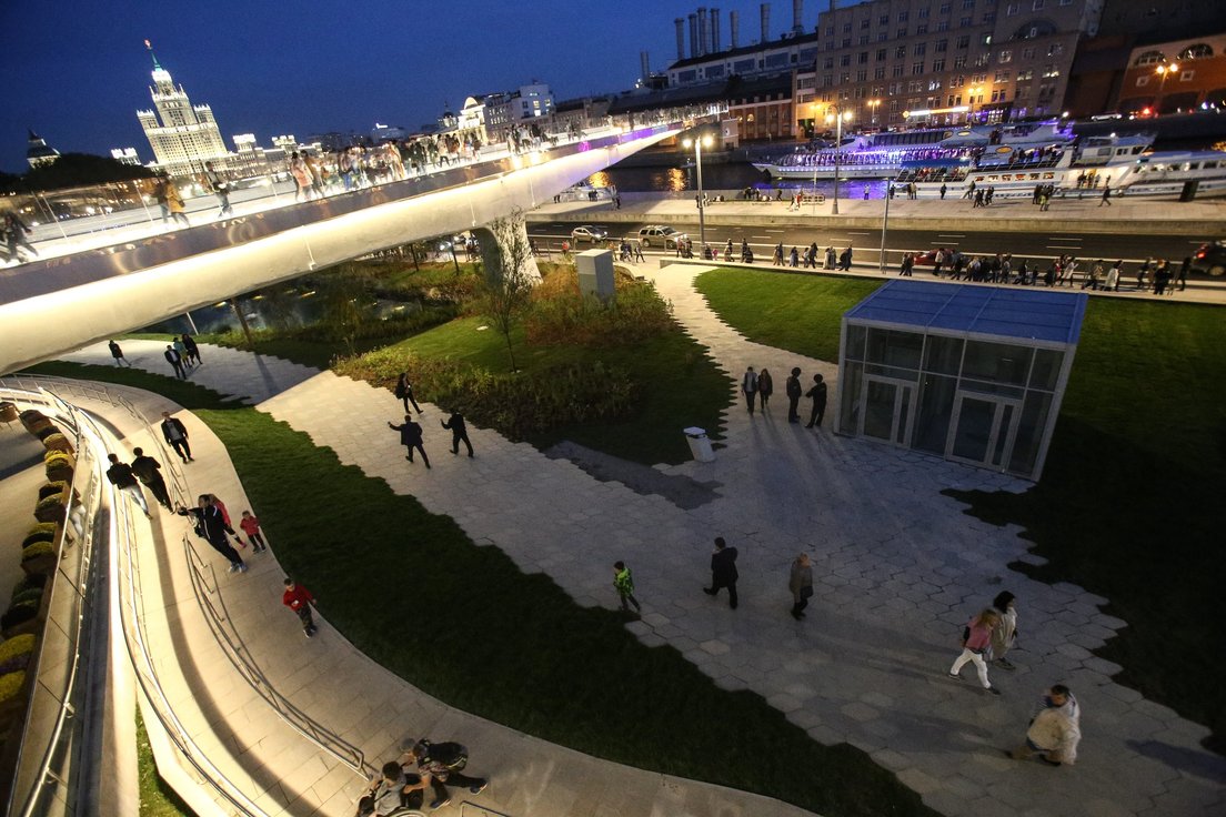 Zariadie ocupa más de 10 hectáreas y mezcla naturaleza y urbanismo. Su llamado 'puente' es una construcción única en el mundo, una pasarela peatonal flotante de 70 metros de largo que se eleva a una altura de 15 metros sobre las aguas del río Moscova.