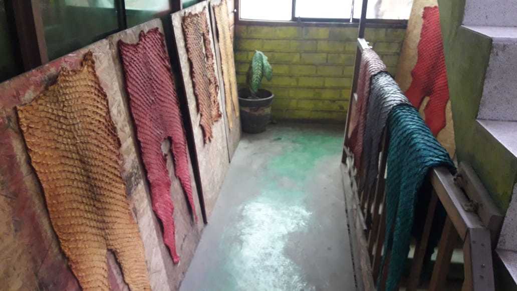Luego, contratan a otras personas para que realicen el descarne y quiten las escamas, lo que permite generar más espacios de trabajo. Una vez completada esta fase, la pareja se encarga del siguiente paso, que es el curtido y teñido de manera natural, sin usar químicos.