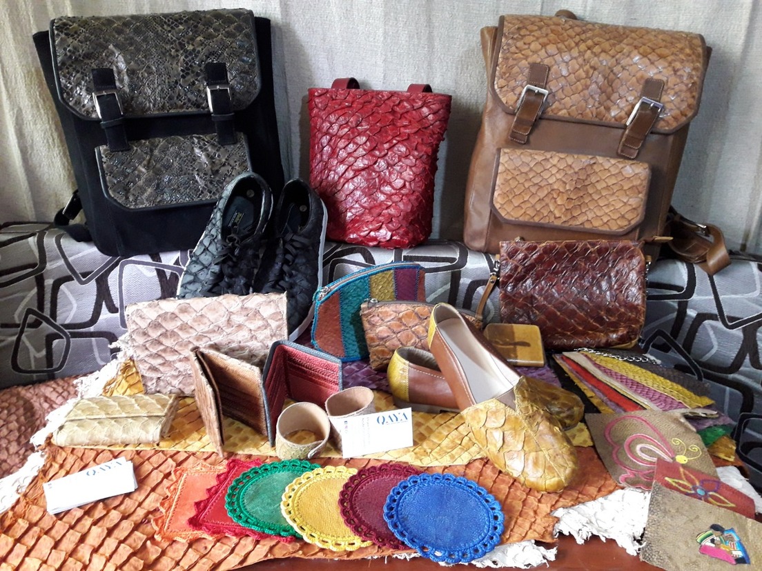 Las pieles que utilizan son, principalmente, de peces de agua dulce, como el pirarucú, el segundo pez de agua dulce más grande del mundo, que encuentran en la Amazonía; así como la tilapia y la trucha. También, del mar usan el dorado, la corvina y la liza.