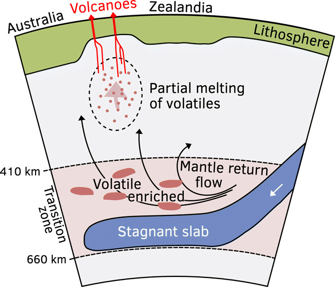 Los resultados del nuevo estudio sugieren que las erupciones se deben a que el fondo marino de la placa del Pacífico está siendo empujado bajo la placa australiana, en un proceso llamado subducción. "Cuando una placa se hunde debajo de la otra, en su camino hacia el interior de la Tierra, la corteza oceánica se rompe y se deforma bajo una presión y temperatura extremas".