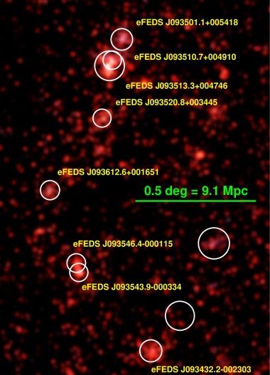 La estructura recién identificada consta de ocho cúmulos galácticos con un mismo valor del desplazamiento al rojo de 0,36, según informó el Instituto Max Planck de Física Extraterrestre el 29 de diciembre. Este dato significa que todos se encuentran aproximadamente a 5.000 millones de años luz del sistema solar.