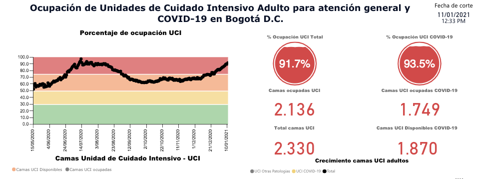 La capital de Colombia se encuentra en alerta roja desde la semana pasada ante el aumento de contagios por covid-19 y la saturación en las Unidades de Cuidados Intensivos (UCI) para atender a pacientes con coronavirus, que ya registran una ocupación de más del 93 %.