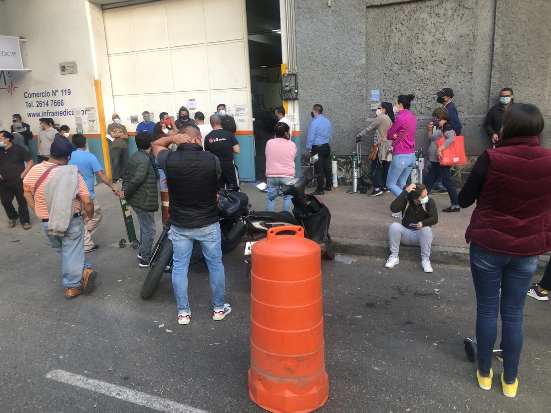 "Más de la mitad del día la dedico a buscar oxígeno. Se termina un tanque y ya tengo que estar rellenando el otro", dice el joven. Nos encontramos en el exterior de la sede de la empresa Infra en la colonia Escandón, en Ciudad de México. Gómez es uno de los últimos de una larga fila que se alarga por dos cuadras. Por delante, cerca de un centenar de personas, todos cargados con tanques de oxígeno para recargar. Tras una semana de experiencia, calcula que tendrá que esperar dos horas hasta que logre rellenar los tanques.