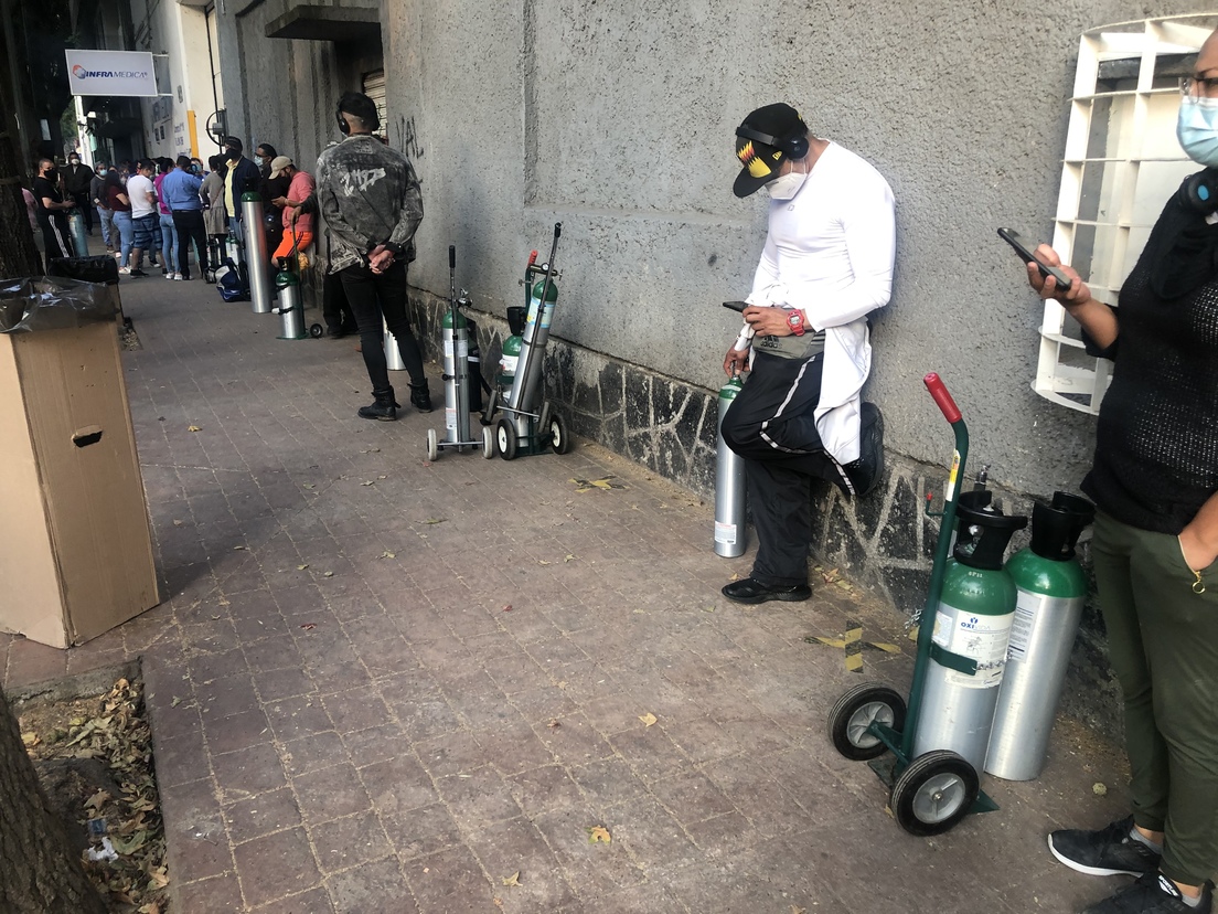 Las filas para conseguir oxígeno se han convertido en uno de los símbolos del colapso sanitario en México, especialmente en la capital. Al inicio de la pandemia, la gente aguardando para recibir un plato de comida mostró la precariedad en la que quedaron atrapados miles de mexicanos. Ahora lo que buscan no es alimento, sino oxígeno para sus familiares enfermos de coronavirus.