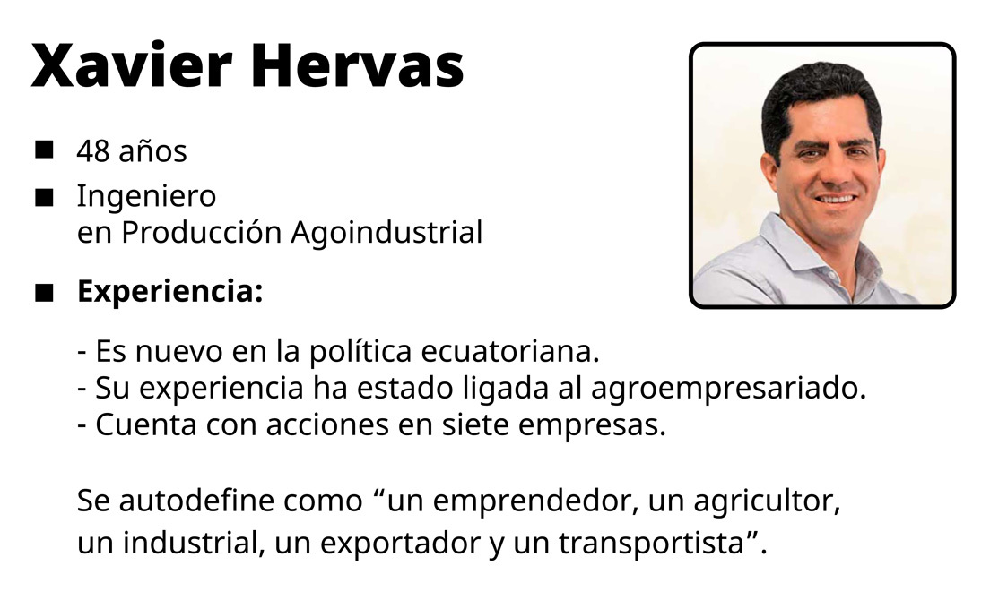 Hervas es un empresario que cuenta con acciones en siete empresas, la mayoría ligada a la agricultura. Estas compañías reportaron ventas por 6 millones de dólares en 2019, según los registros de la Superintendencia de Compañías.