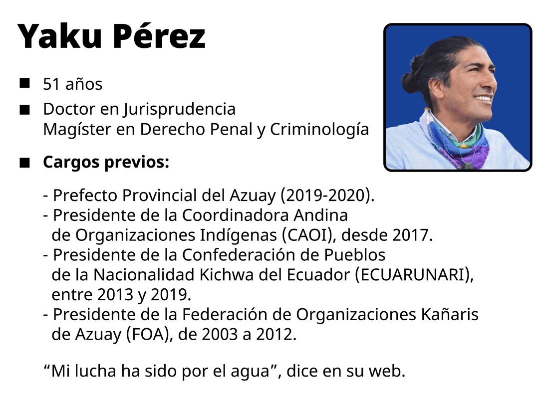 Pérez, cuencano, es el aspirante que representa al movimiento indígena ecuatoriano por el partido Pachakutik. Su candidatura fue motivo de discusión interna en la organización, puesto que al principio no era apoyada por la CONAIE, organización que movilizó a miles de personas en las protestas antigubernamentales de octubre de 2019.