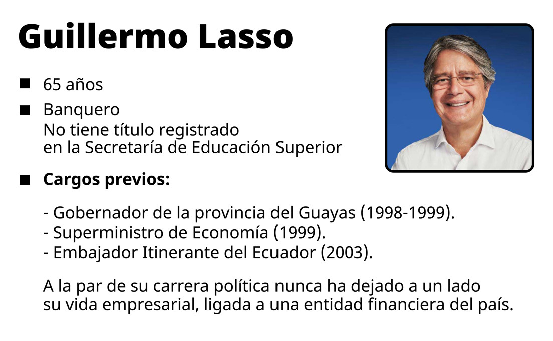 Esta es la tercera vez que el guayaquileño Lasso aspira a ser presidente de Ecuador. Ya lo hizo en 2013 y en 2017, quedando en segundo lugar en ambos comicios.