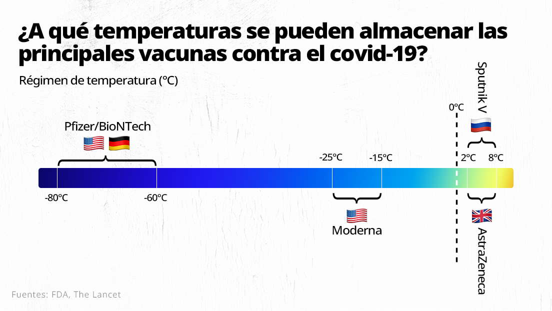 Concretamente, el fármaco de Pfizer se puede almacenar a entre -80 º C y -60 º C, mientras que el de Moderna, a entre -25 º C y -15 º C. En el caso de la vacuna de AstraZeneca, la temperatura es la misma que necesita la Sputnik V: entre 2 º C y 8 º C.