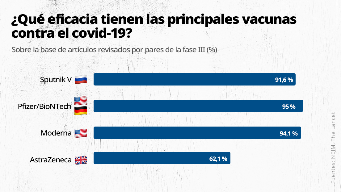 Según los artículos revisados por pares de la fase III, tres de los cuatro antídotos mencionados han mostrado una eficacia general de más de un 90 %: Sputnik V (91,6 %), la vacuna de Pfizer (95 %) y la de Moderna (94,1 %). Entretanto, la efectividad estimada del fármaco de AstraZeneca es de un 62,1 %.