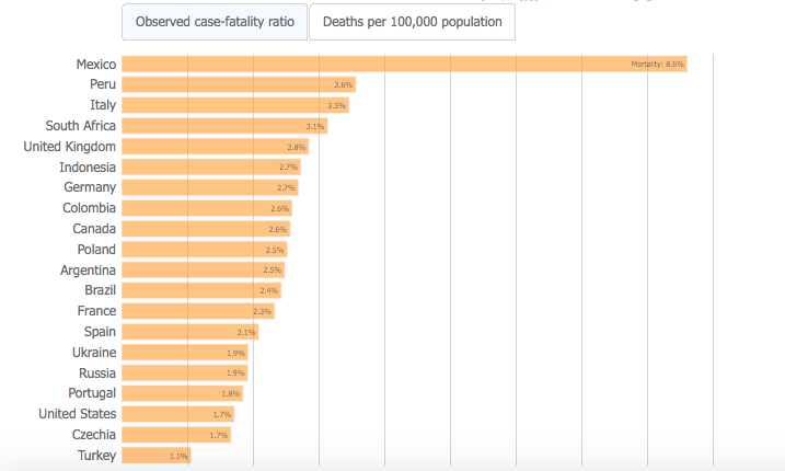 México tiene la tasa de letalidad por covid-19 más alta del mundo, según información publicada por la Universidad Johns Hopkins, con sede en Baltimore, Maryland (EE.UU.).