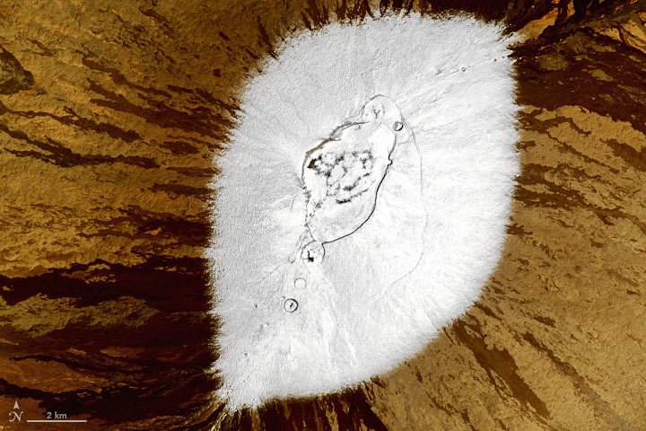 En la imagen, tomada el 6 de febrero por el sensor Operational Land Imager del satélite Landsat-8, se observa el sorprendente contraste entre los picos nevados de los dos volcanes más altos de la cadena de islas (con altitudes superiores a 4.100 metros) y la roca volcánica.