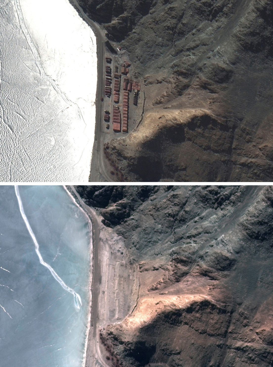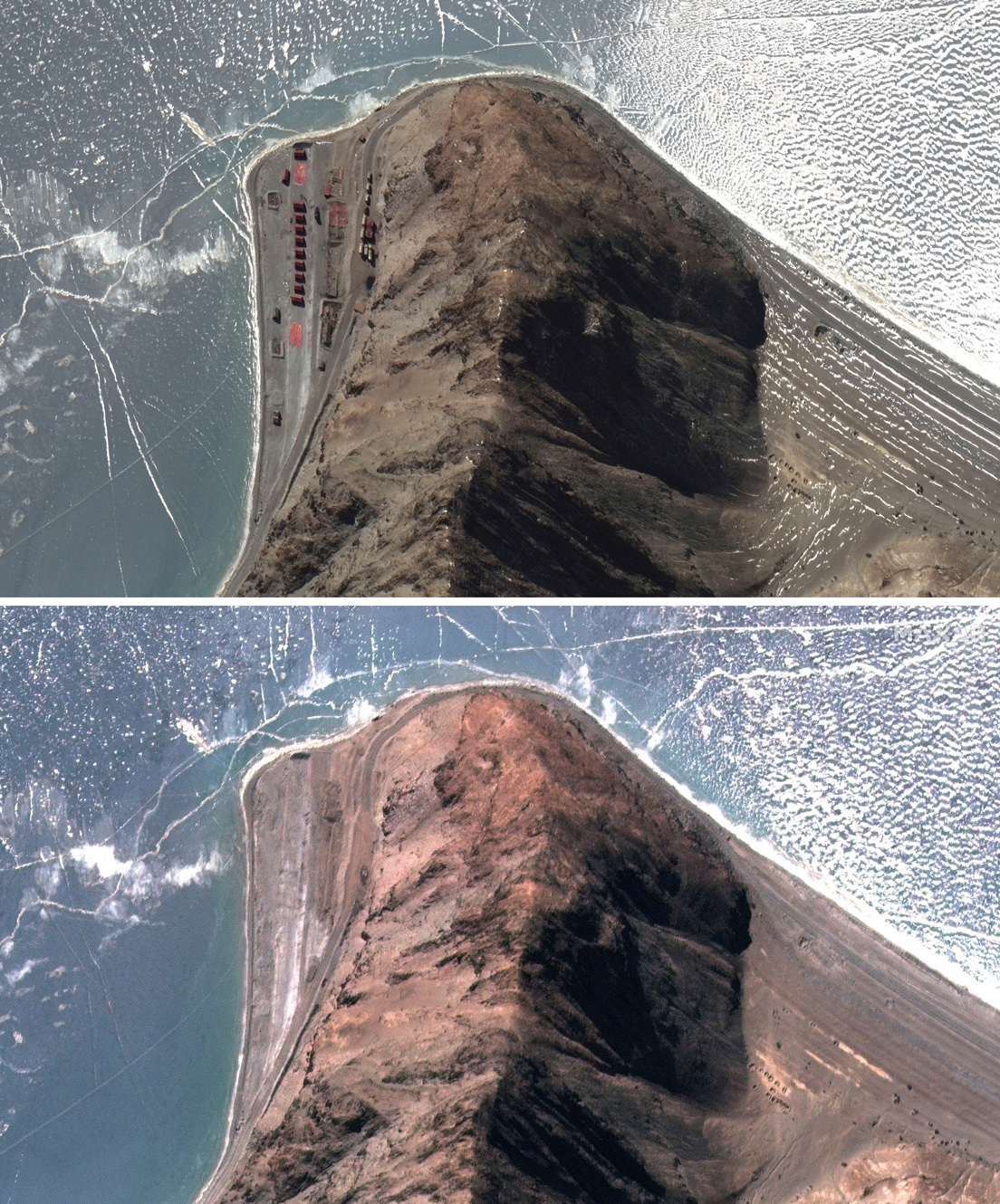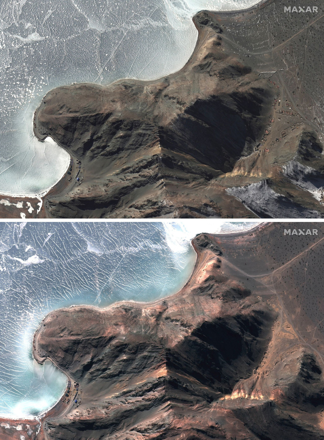 Las imágenes satelitales de algunas zonas de la costa norteña del lago proporcionadas esta semana por Maxar Technologies muestran que múltiples objetos militares observados allí a finales de enero han sido retirados.