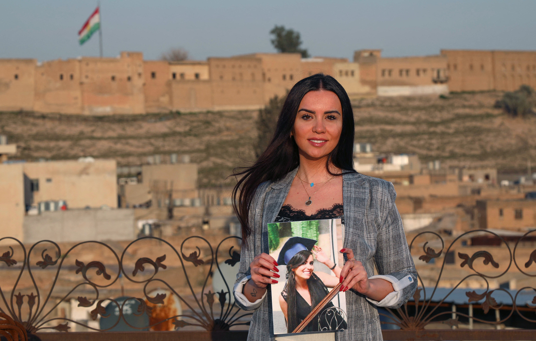 En esta imagen reciente Dima al-Kaed sostiene una foto de 2013 en la que se gradúa en la Universidad de Damasco. Durante la guerra perdió a sus padres y su hogar. "Soñaba con cambiar el mundo, pero en cambio la guerra cambió el mío", afirma.