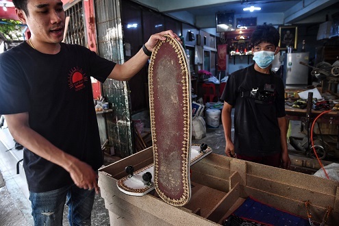 Anusorn Yungyearn, un fabricante de ataúdes tailandés, ha decidido crear patinetas a partir de la madera de los féretros sin vender que guarda en su taller de la ciudad de Bangkok.