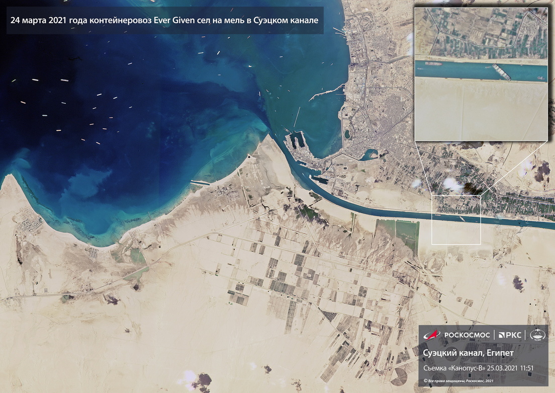 El jueves, el satélite Canopus-B de la agencia espacial rusa Roscosmos captó la entrada meridional del canal de Suez, bloqueado desde el encallamiento del carguero MV Ever Given. En la imagen se puede apreciar decenas de embarcaciones esperando a poder pasar por la vía marítima.