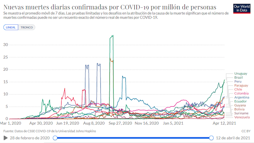De acuerdo con el sitio web Our World in Data, de la Universidad de Oxford, que publica datos sobre el avance de la pandemia en el mundo, Uruguay, de aproximadamente 3,5 millones de habitantes, ha registrado en los últimos siete días, del 5 al 12 de abril, una tasa promedio de 15,91 muertes por cada millón de habitantes. Con ello, supera a Brasil, que tiene una media de 14,7.