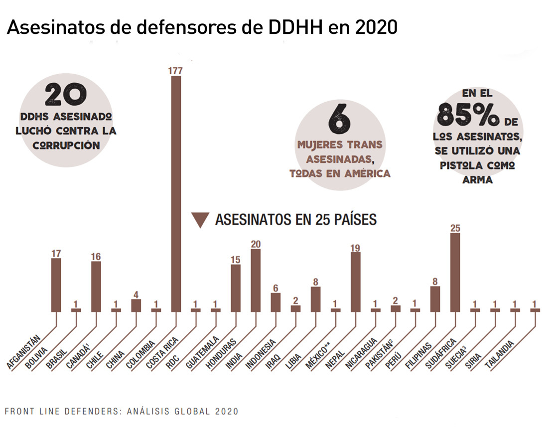 El año pasado, al menos 331 defensores de los derechos humanos fueron asesinados en todo el mundo, según detalla el informe 'Análisis Global 2020' de Front Line Defenders, lanzado este jueves 15 de abril.