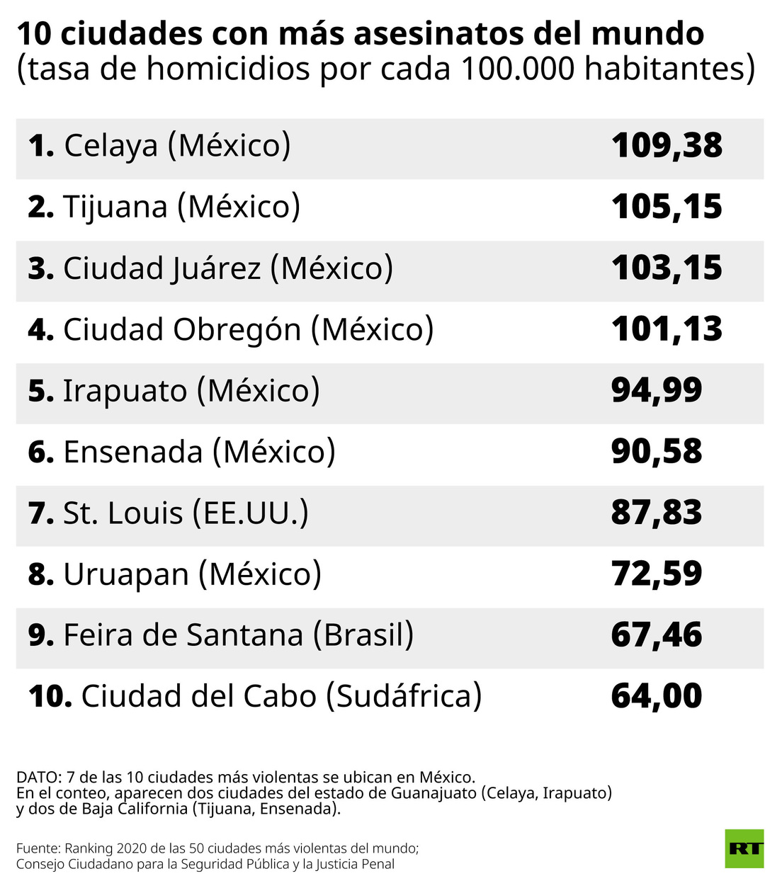 México tiene siete de las diez ciudades más violentas del mundo, de acuerdo con un informe reciente que ubica a la localidad de Celaya, en el estado de Guanajuato, como la urbe con más asesinatos del mundo en 2020.
