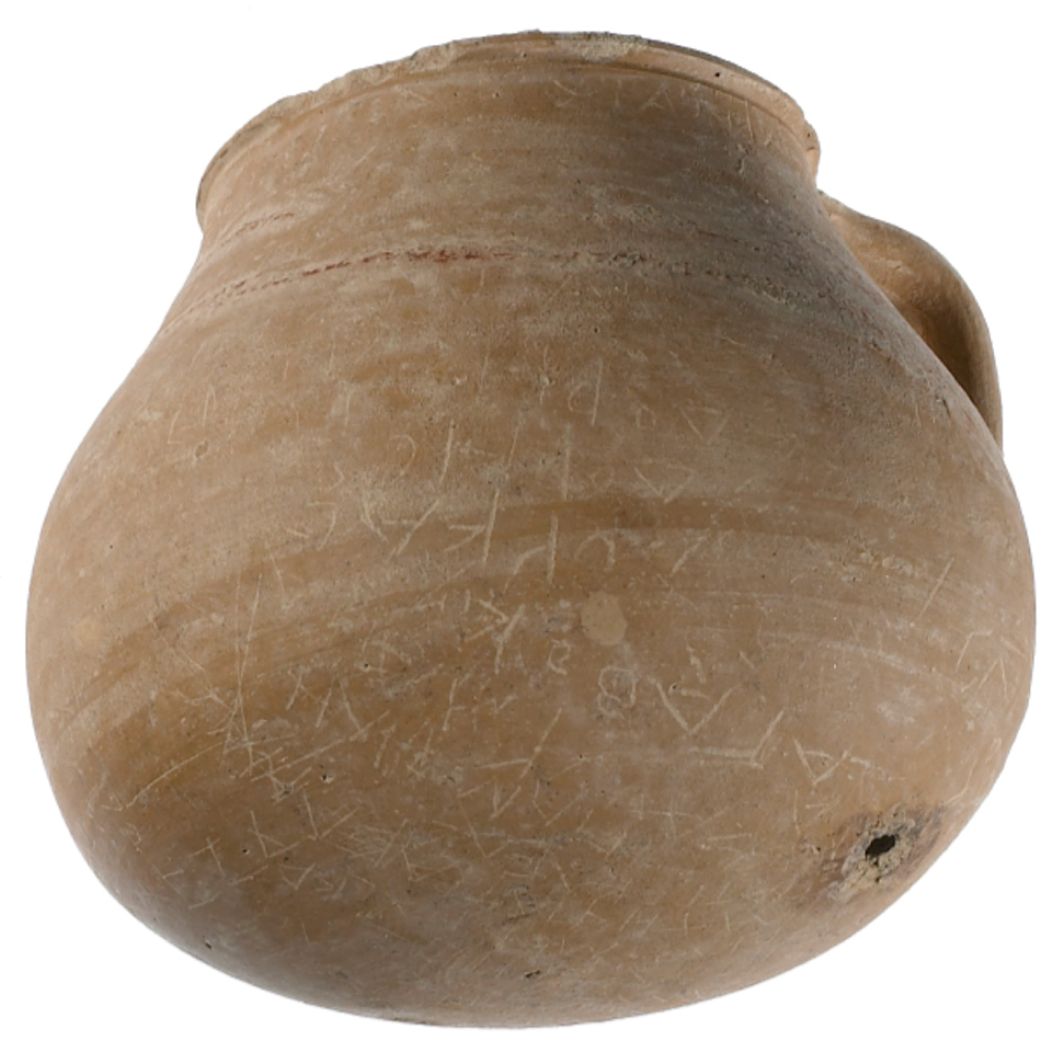 "Todas las superficies exteriores [de la jarra] estaban originalmente cubiertas con texto; originalmente tenía inscritos más de 55 nombres, de los cuales decenas ahora sobreviven solo como letras dispersas, flotantes o trazos de lápiz tenue", escribió Lamont, señalando que la escritura griega contiene palabras que pueden significar "nosotros atamos".