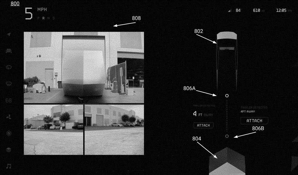 En la nueva solicitud de patente, las imágenes también muestran la interfaz de usuario de la camioneta eléctrica en modo de arrastre con un remolque.