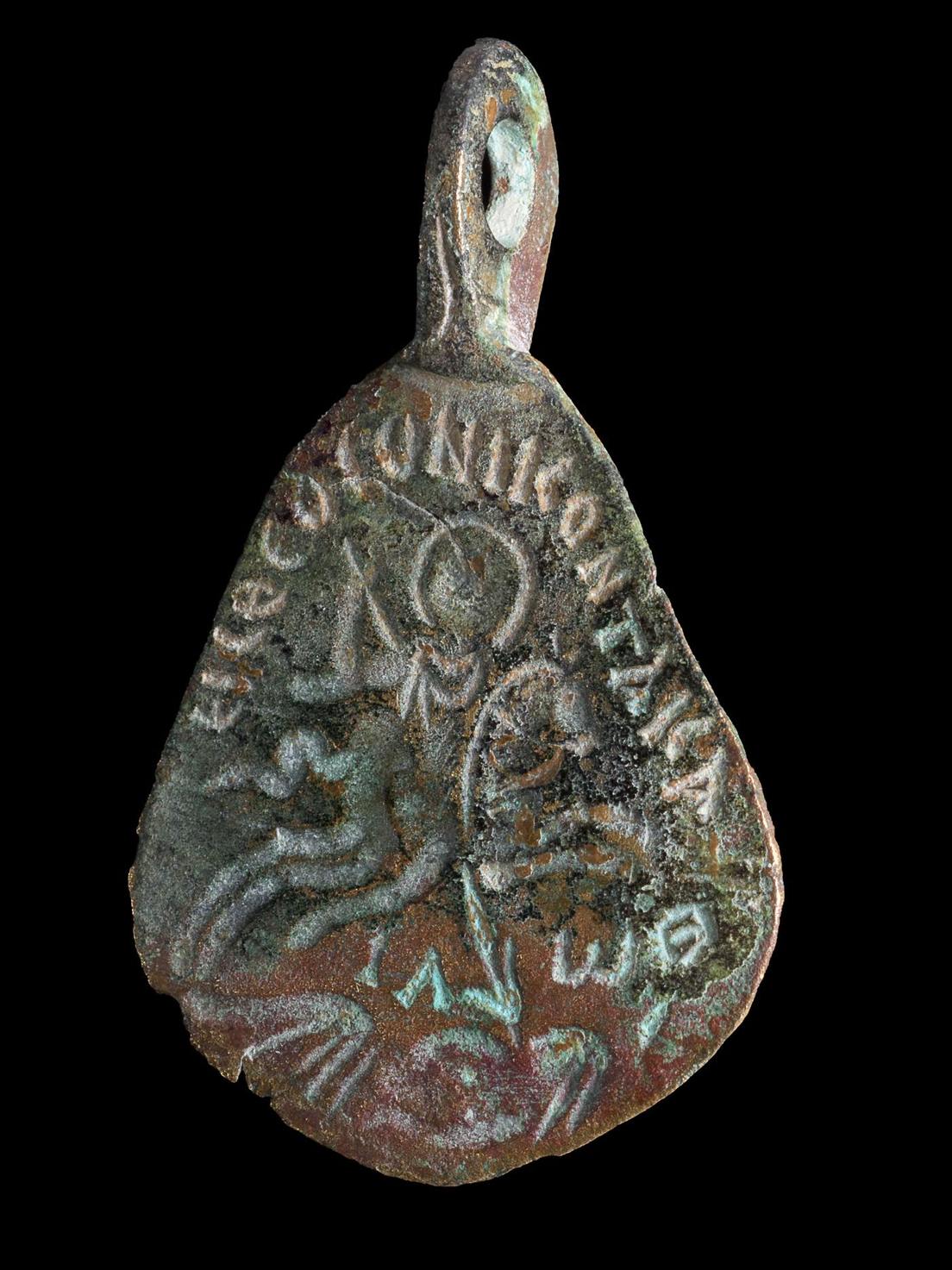 En una de las caras del colgante aparece la figura de un jinete a caballo, representado en el acto de lanzar una esfera a una figura femenina que está en el suelo y fue identificada por los expertos como Gello, demonio de la mitología griega que amenaza a mujeres y niños.