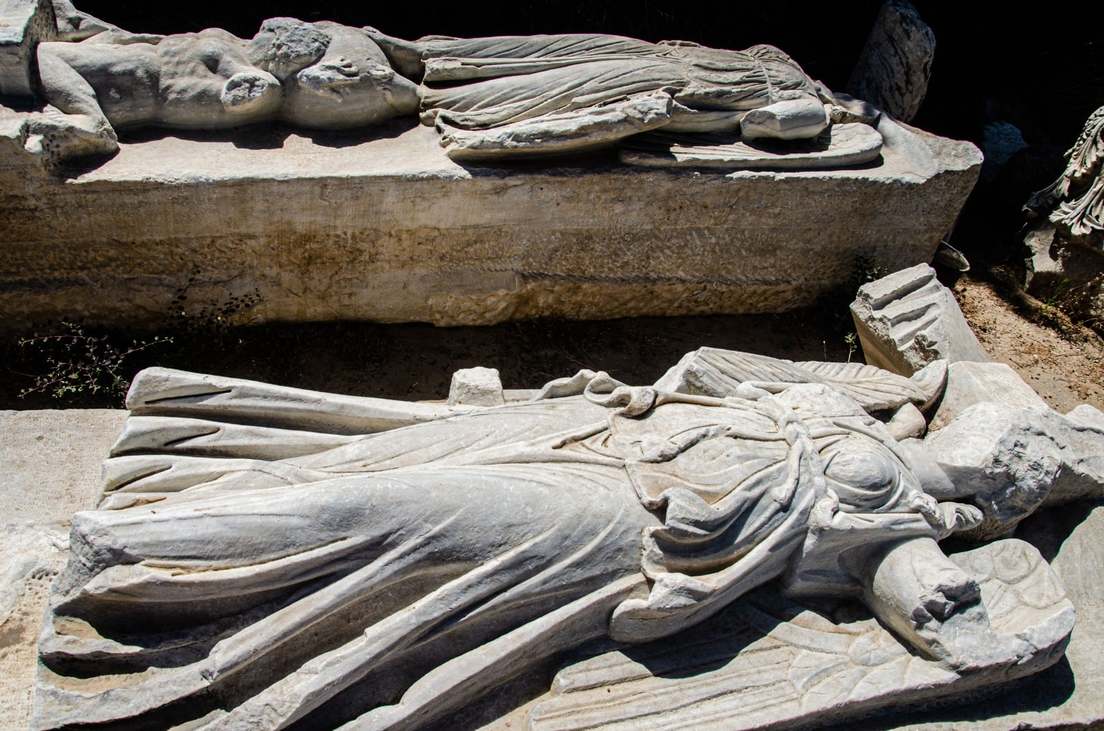 A lo largo de varias décadas de excavación arqueológica se han encontrado unos 200 objetos de mármol de gran tamaño, lo que, en opinión de los expertos, pone de manifiesto la gran fastuosidad del recinto. Entre las piezas más destacadas figuran un estatua de Nike, la diosa de la victoria, sostenida por el dios Atlas, así como una efigie de Isis, una deidad egipcia representada como Tyche, la diosa de la fortuna de la ciudad.