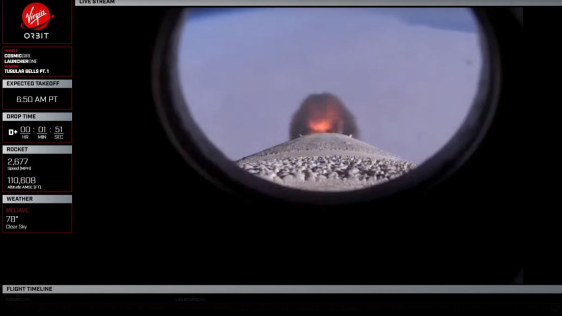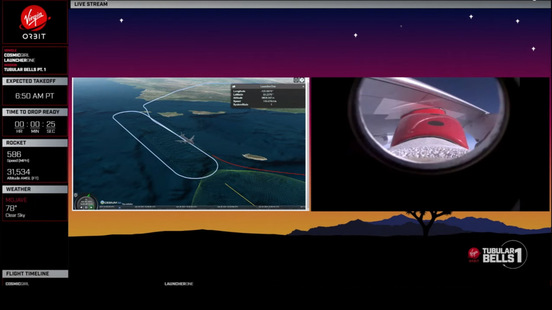 El avión despegó este 30 de junio del aeródromo de Mojave, en California, antes de lanzar menos de una hora más tarde el cohete LauncherOne con siete satélites. La misión, denominada 'Tubular Bells: Part One', fue transmitida por primera vez en directo en la página de la compañía estadounidense.