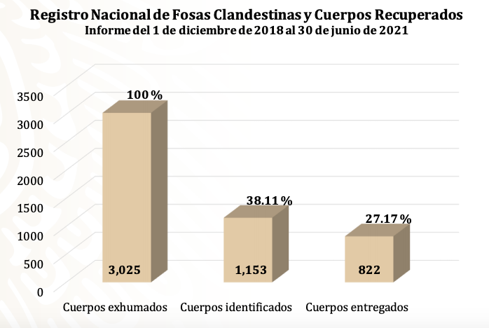Desde que el 1 de diciembre de 2018 arrancó el mandato de Andrés Manuel López Obrador y hasta el 30 de junio de 2021, la Segob ha contabilizado 1.749 fosas clandestinas, con 3.025 cuerpos exhumados.