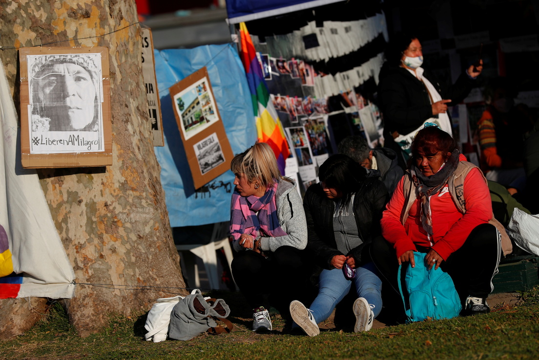 "Sin Milagro, no hay feminismo posible", dice una pancarta, mientras las banderas de los pueblos originarios se apoderan de la escena. "Argentina plurinacional", se lee en una enorme tela sostenida en el aire. De fondo, se escucha la melodía de instrumentos típicos, como el sikus y el charango. Por momentos, desde la tienda principal reproducen cumbia a todo volumen, cuyo eco retumba en la entrada de la sede gubernamental.