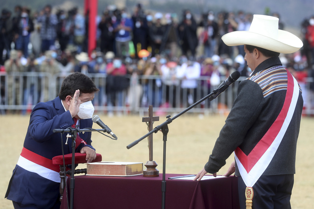 La tarde del jueves durante el acto en la Pampa de la Quinua, Castillo juramentó a Guido Bellido Ugarte como el nuevo presidente del Consejo de Ministros del país andino, un día después de asumir la presidencia ante el Congreso, en Lima. El parlamentario del partido Perú Libre juró en español y en quechua "por por la lucha contra la corrupción" y "por el trabajo para el pueblo peruano".