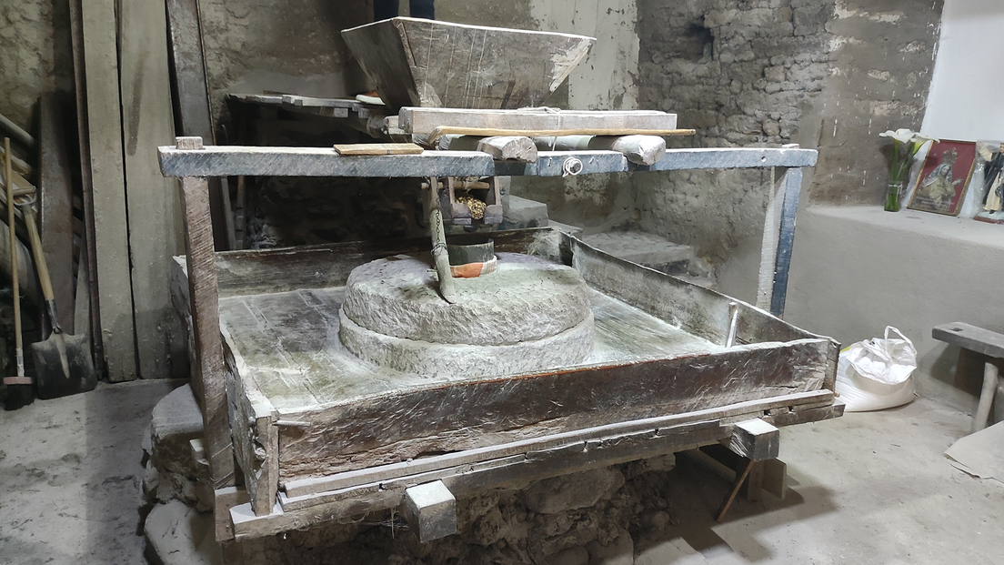 Arriba de las piedras está la tolva, una especie de embudo gigante, en forma de pirámide invertida, donde se echa el grano y tiene capacidad para un quintal (100 kilos). Bajo esta está la canaleta, donde llegan las especies y luego pasan al orificio que tiene la piedra.