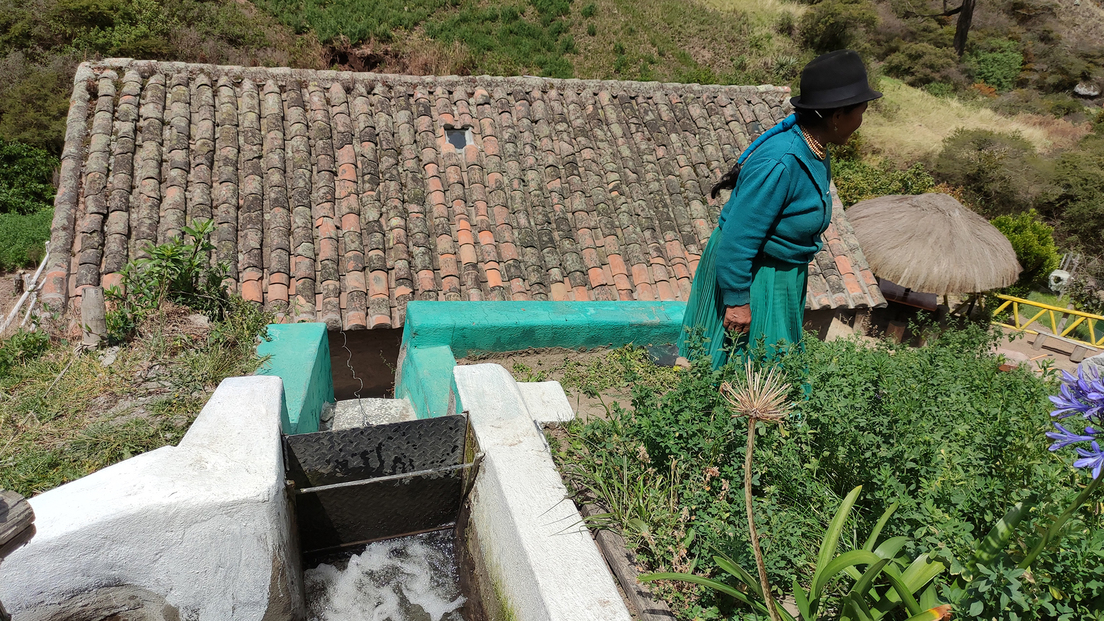El agua es de una quebrada que proviene del páramo andino, que desemboca en el río Pisque; a esta no le permiten el paso constantemente bajo la casa y, por tanto, el molino no está funcionando de manera continua. En la parte de arriba de la construcción hay una compuerta que se abre y se cierra cuando es necesario llevar a cabo la molienda; esta era de madera, pero "como vive día y noche en el agua", comenta Quimbiamba, "se pudría y se hacía bien pesada", tanto que ya a ella se le dificultaba levantarla, por lo que decidieron ponerle una de metal.