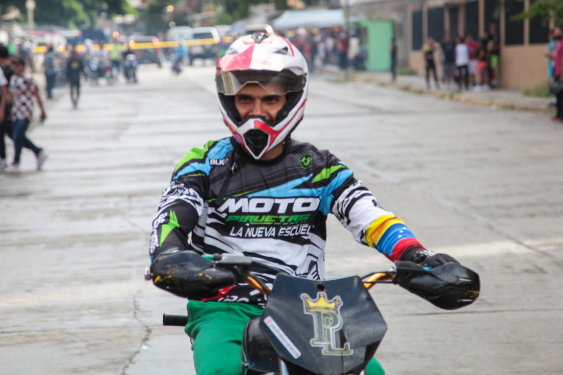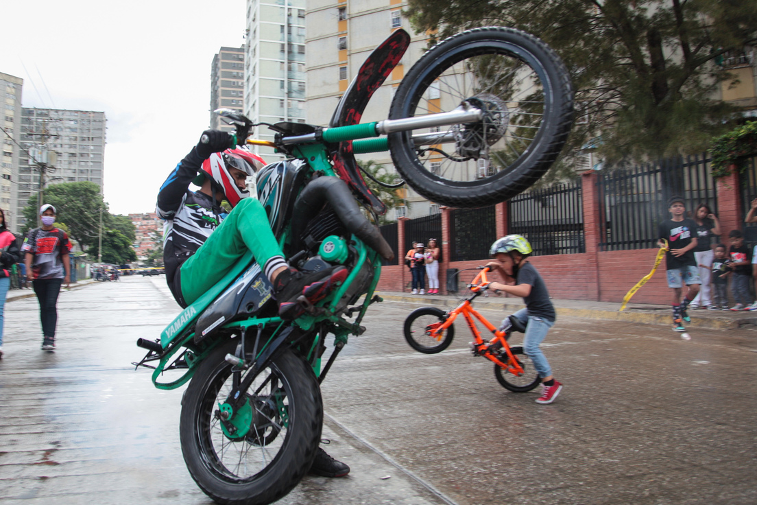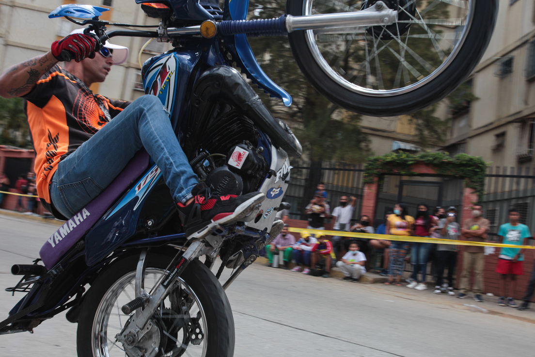 Un sábado a mediodía en un barrio caraqueño se interrumpe la cotidianidad y solo se escucha el rugido de las motos. Mientras transcurren los minutos, más vecinos se agrupan en la acera para contemplar con curiosidad un espectáculo que en Venezuela nació en los barrios populares: las motopiruetas.